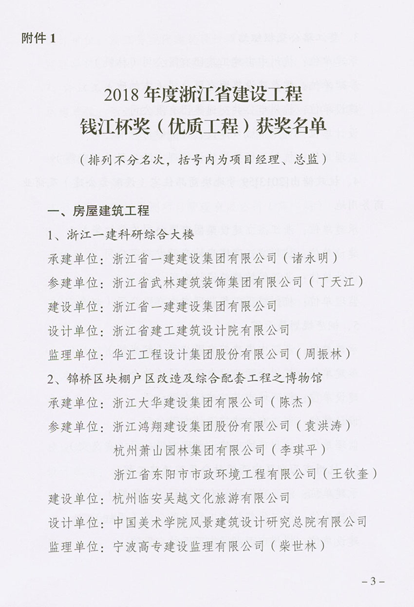 喜報!近日,省建設廳頒發了2018年度浙江省建設工程“錢江杯”(優質工程)文件,我公司“麗水市體育館體育中心工程、松陽縣供電局電力調度生產綜合用房工程”分別獲得2018年度“錢江杯”(優質工程)獎。
