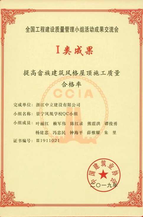 該成果在2019年全國工程建設(shè)質(zhì)量管理小組活動(dòng)成果交流會(huì)發(fā)布,并獲得全國工程建設(shè)質(zhì)量管理小組活動(dòng)成果Ⅰ類成果獎(jiǎng),是該批(第三批,共四批)發(fā)布的浙江省唯一的一個(gè)Ⅰ類成果,這也是麗水地區(qū)首個(gè)全國工程建設(shè)質(zhì)量管理小組活動(dòng)成果Ⅰ類成果。