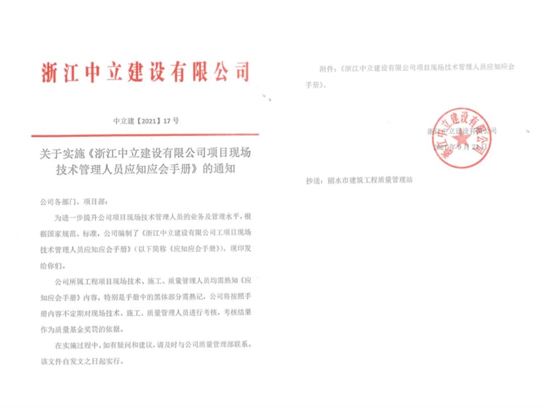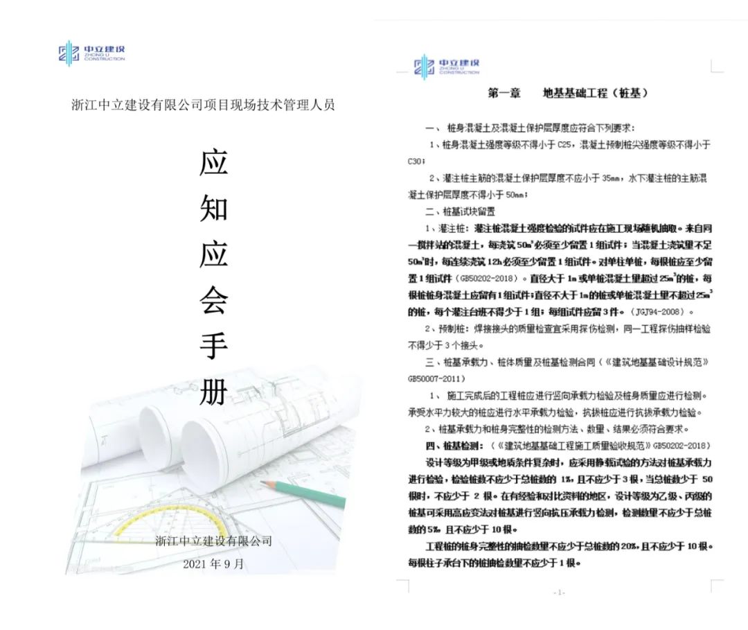 為進(jìn)一步提升公司項目現(xiàn)場技術(shù)管理人員的整體業(yè)務(wù)和管理水平,積極開展“質(zhì)量月”活動,根據(jù)國家標(biāo)準(zhǔn)規(guī)范,中立建設(shè)編制了《浙江中立建設(shè)有限公司工項目現(xiàn)場技術(shù)管理人員應(yīng)知應(yīng)會手冊》,并于9月23日發(fā)文實施。這是繼今年6月份我公司出臺的《工程質(zhì)量通病防治(2021試行)》后的又一重要技術(shù)性手冊。